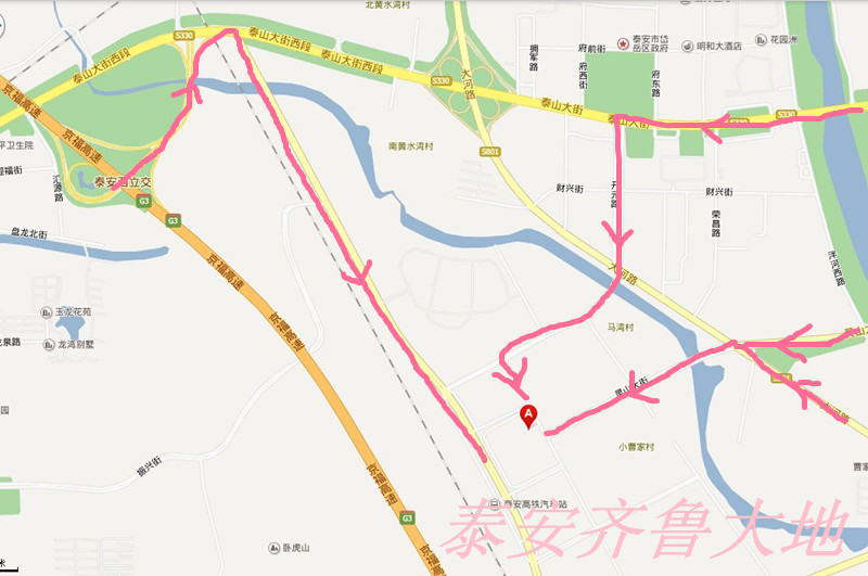 沿104国道行走,注意泰山大街路口,到泰山大街路口向西,经过光彩大市场、岱岳区政府继续向西1.5公里路南就是。